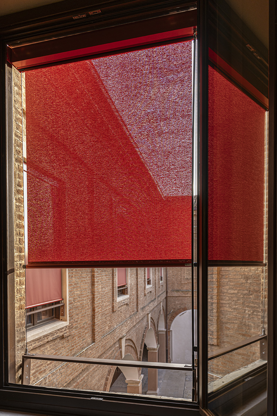 The original solar shading, traditional “Ferrarese” style package curtains, were reinterpreted using advanced technologies and innovative materials. The installed blind models, including L1 504, L1 505, L1 511, and L1 512, feature C91 and C104 cassettes in painted RAL 3016 amaranth red aluminum, combined with Soltis 92 Perform fabric in brick red (code 38180). This flame-retardant fabric has an opening factor of 4%, perfectly complementing the blind’s structure and providing a durable, weather-resistant technological solution with excellent energy performance to reduce aesthetic impact and maintenance costs.