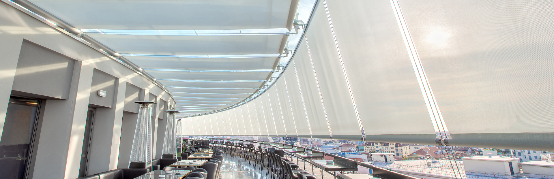 A Milanese jewel embellished by the Resstende solar shading system. 90 completely custom-made roller systems for the roofing of the new panoramic restaurant on the tenth floor of the hotel. The high level of installation precision of the Dallas and Traction Kit systems ensures PERFECT PERPENDICULARITY BETWEEN THE HORIZONTAL AND VERTICAL CABLES, for a “continuous line” effect. The white/silver weft of the Vuscreen Catania fabric, Code 31968, aligns with sophisticated elegance in the design of the terrace, allowing the city skyline to shine through. A challenging project, which rendered the shading an integral part of the building’s architecture.