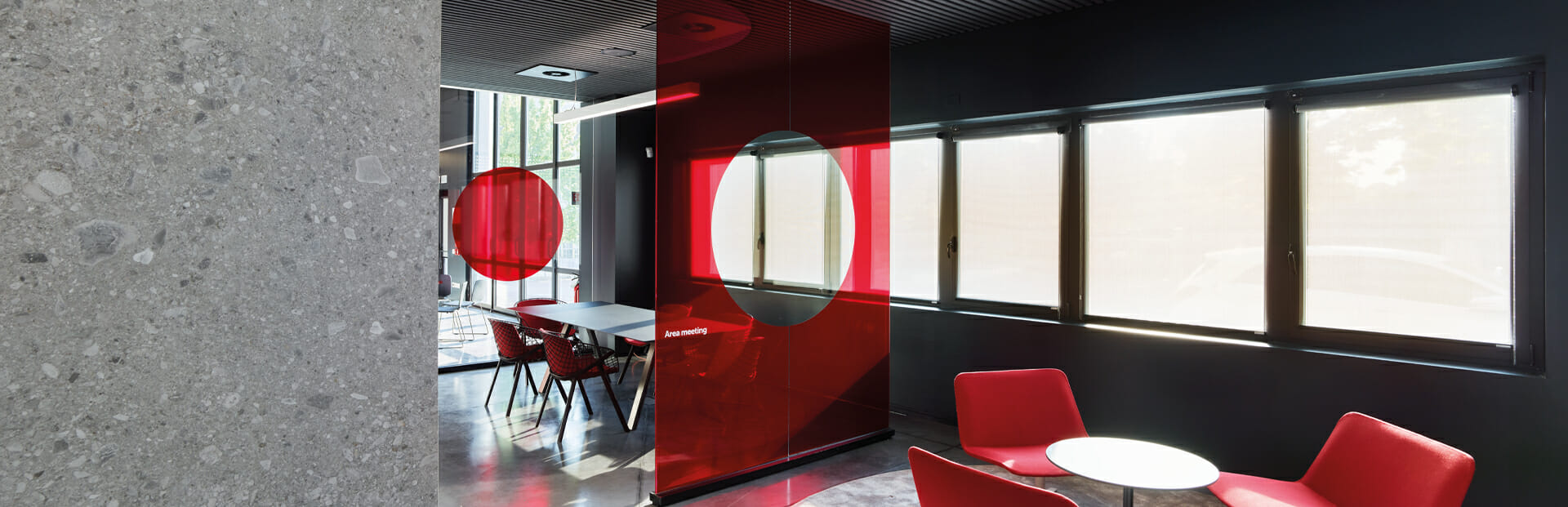 This project transformed a manufacturing building into a multifunctional complex with offices, production area and training room. The windows, offices and multi-purpose spaces are internally shielded by F 101 chain systems, whilst the reception area is externally shielded by a significant Extreme L1 system. The auditorium is equipped with a dual screening system: F110 with shading fabric to attenuate direct sunlight and ZIP to ensure the total blackout of the room. The range of greys on the architectural surfaces and the fabrics chosen refer to the industrial origin of the complex, punctuated by certain details in bright red.