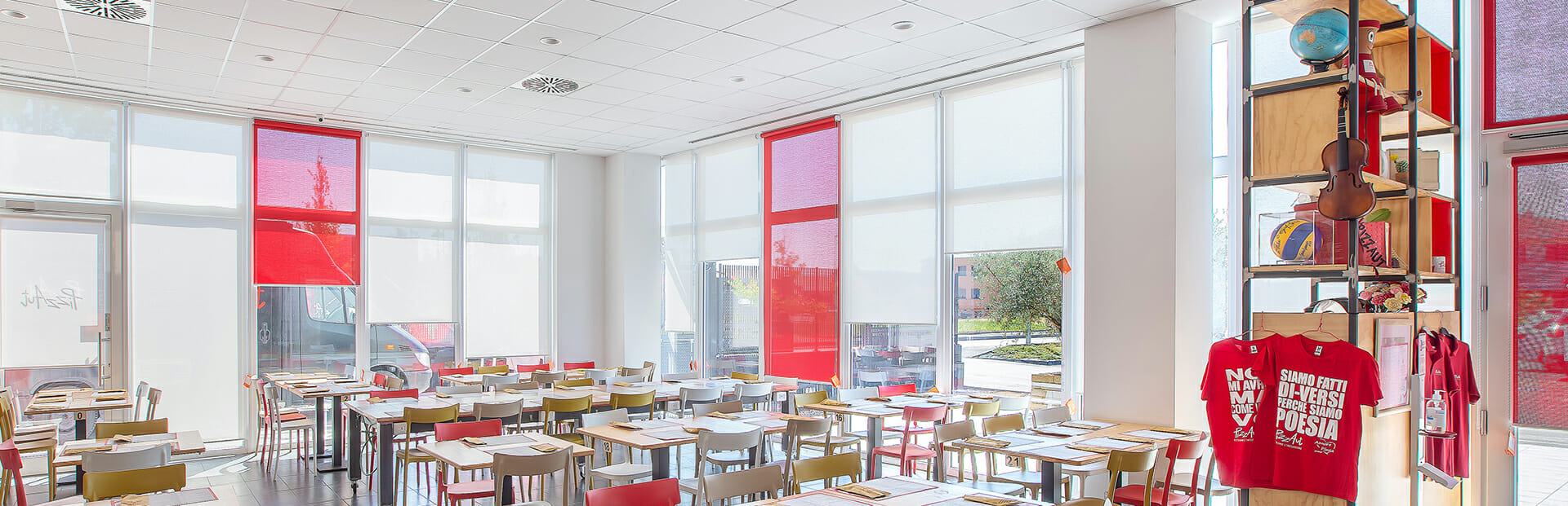 The installation consists of 13 internal screens roller blinds: F112 model, with metal chain. The curtains are fixed to the wall with 52 x 80 mm fixing brackets and white PVC bracket covers. The F21 backdrop is also white in color and made of extruded aluminum with PVC caps. The selected fabric is the Soltis Perform 92 shading, white color cod. 38044 and Soltis Lounge 96 red color cod. 39855: shades that integrate harmoniously with the decor of the location, giving freshness and natural light to the environment thanks to the 4% opening factor that characterizes the microperforation of the fabric. White was chosen as the predominant color enriched by red which represents the lively identity of PizzAut.